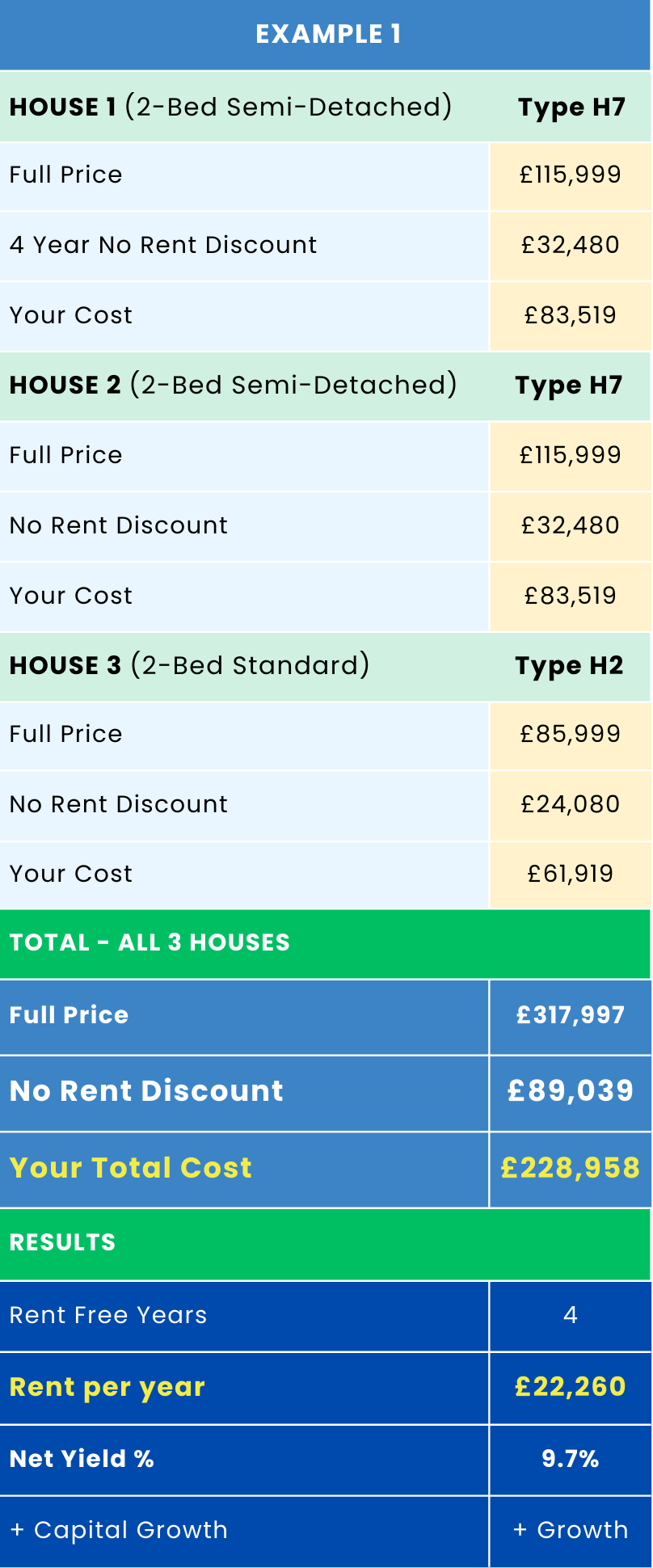 The 3 agreements that we normally send out at the Reservation Stage are 2x Semi-Detached 2-Bedroom properties (Type H7 Flexi-Furnished) at £115,999 each and 1x Standard 2 Bed property (Type H2 Flexi-Furnished) at £85,999. Total deal cost £228,958 plus stamp duty and transfer costs.